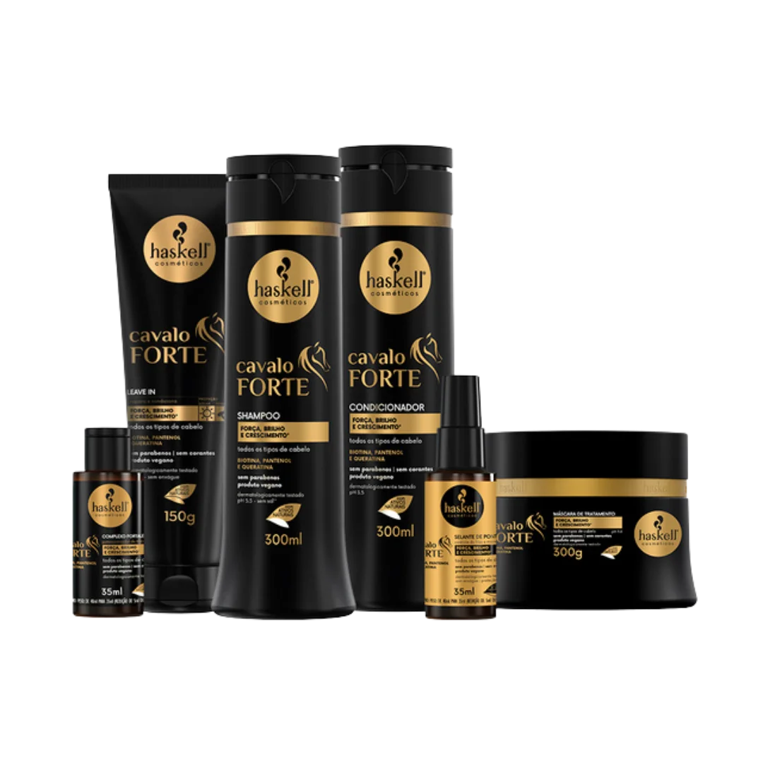 La línea Cavalo Forte fue desarrollada para fortalecer y favorecer el crecimiento del cabello. Su fórmula concentrada contiene biotina, pantenol y queratina, ingredientes activos que, juntos, promueven un tratamiento de alto rendimiento que reduce el riesgo de rotura, reconstruye y refuerza la estructura interna del cabello.