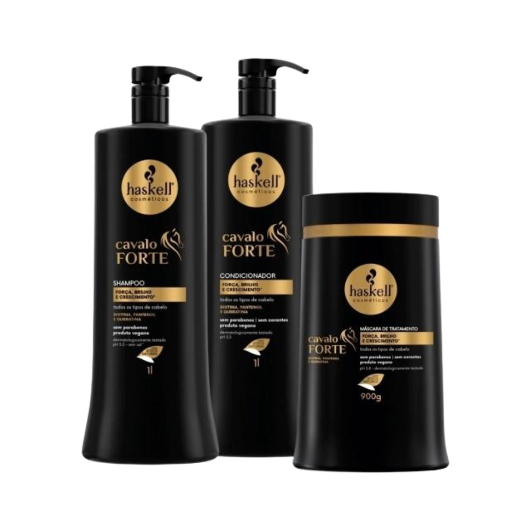 La línea Cavalo Forte fue desarrollada para fortalecer y favorecer el crecimiento del cabello. Su fórmula concentrada contiene biotina, pantenol y queratina, ingredientes activos que, juntos, promueven un tratamiento de alto rendimiento que reduce el riesgo de rotura, reconstruye y refuerza la estructura interna del cabello.