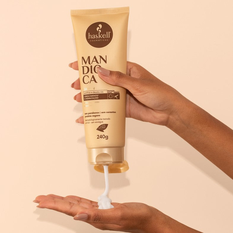 Sobre el cabello limpio y húmedo, aplicar una cantidad suficiente de producto sin aclarado en las palmas de las manos. Distribuir uniformemente a lo largo del cabello y terminar como se desee. Sin enjuague. Mejora los resultados utilizando toda la línea Mandioca